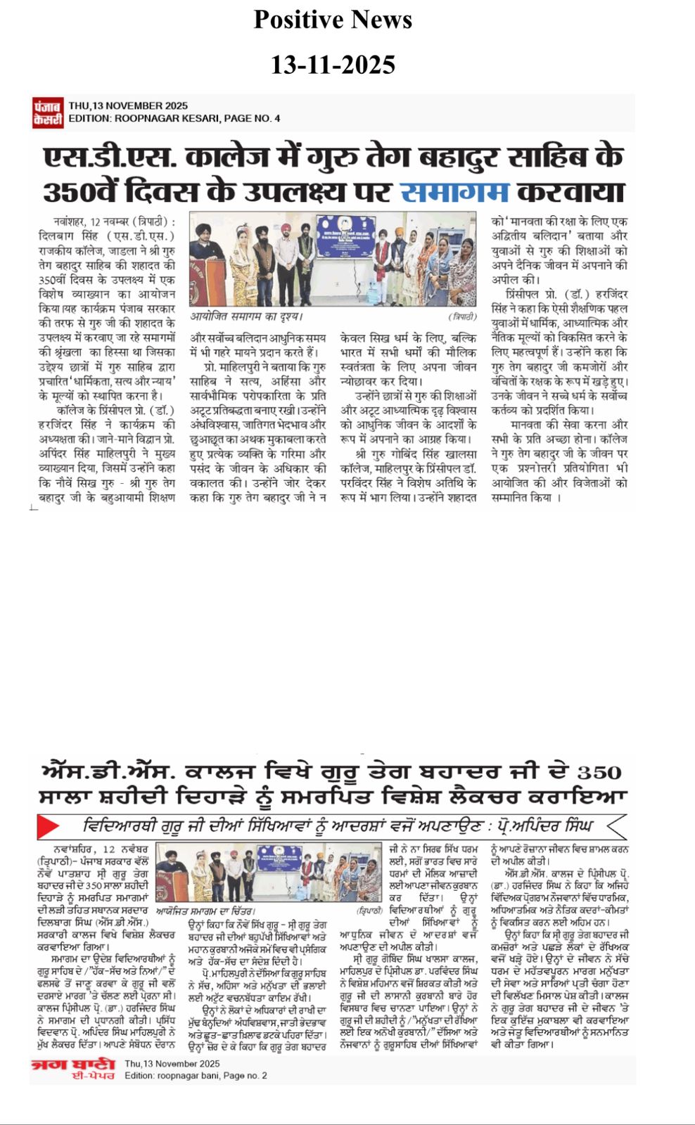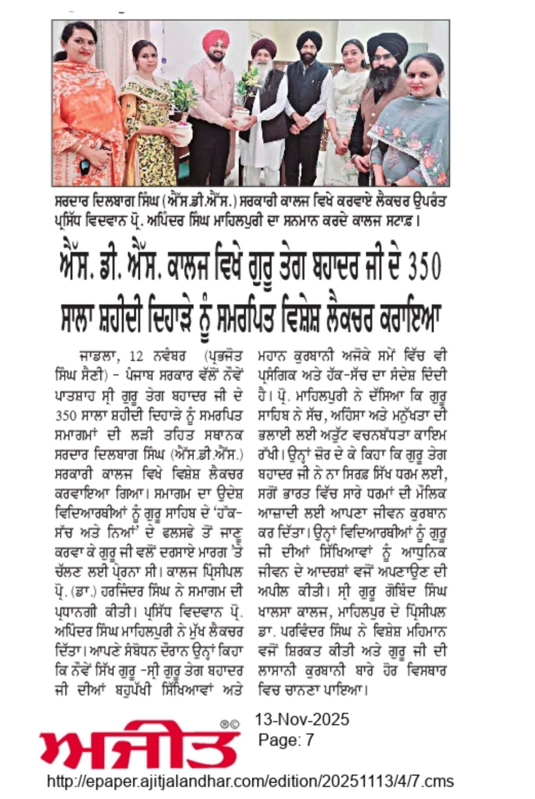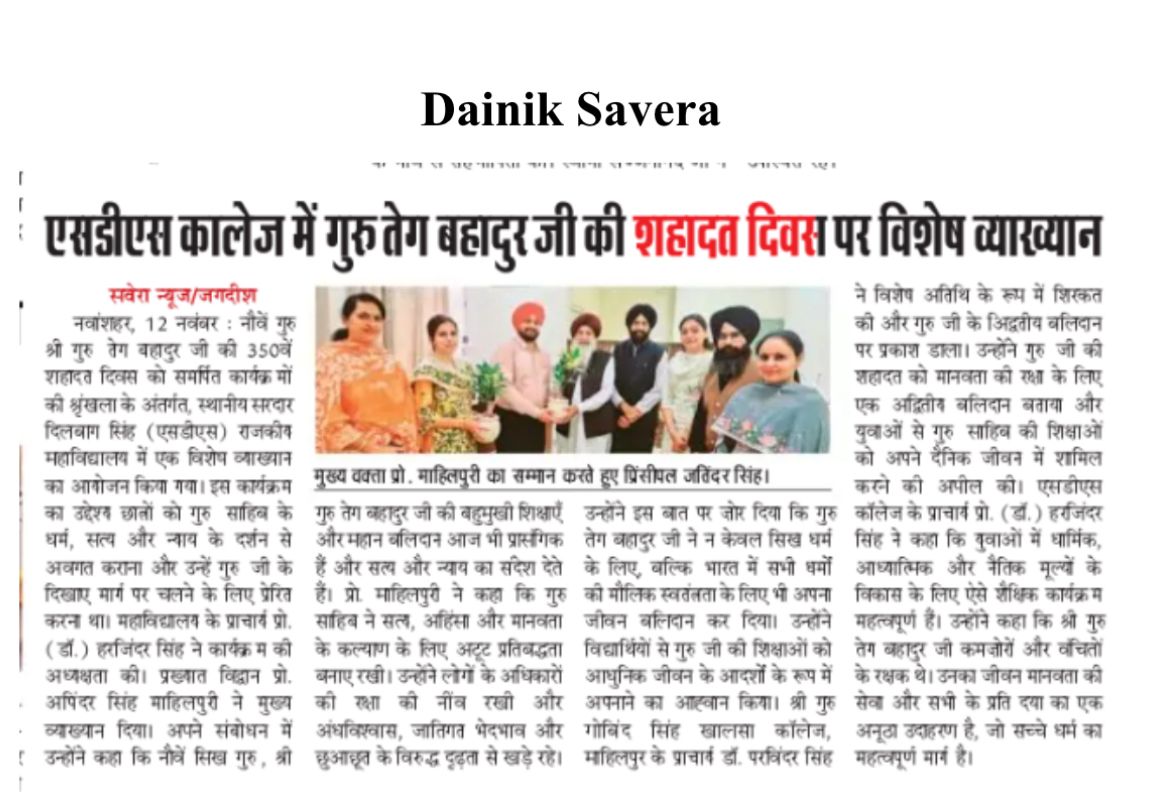 Prof. Harjinder Singh emphasized the spiritual and moral significance of Guru Tegh Bahadur Ji’s sacrifice. He encouraged students to embrace the Guru’s teachings and principles in their own lives. The lecture included a discussion on Guru Ji’s legacy, his role as the father of Guru Gobind Singh Ji, and the values he stood for.